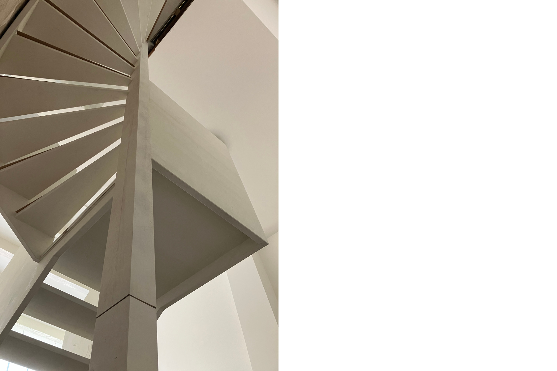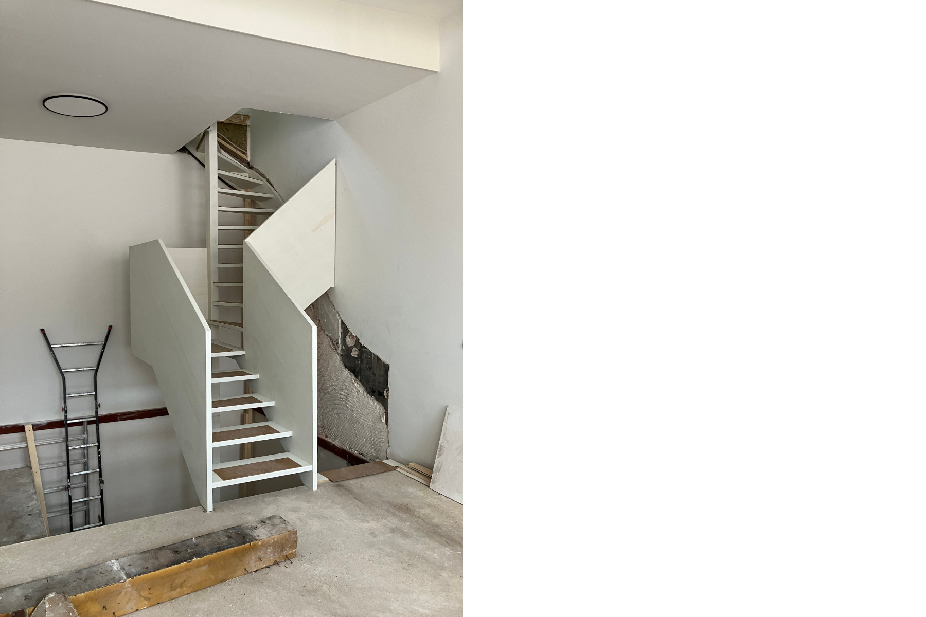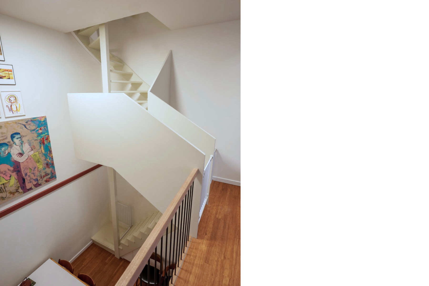 De nieuwe, langs de zijwand geplaatste trap versterkt door zijn vertikale karakter de ruimtelijke verbinding van de twee ruimtes.