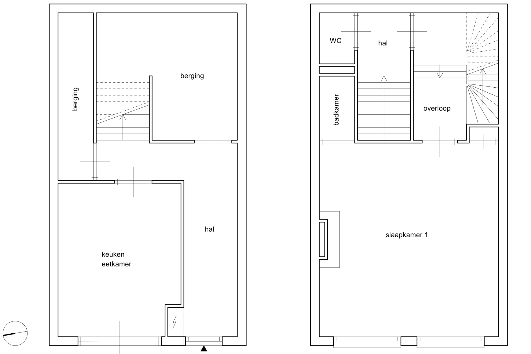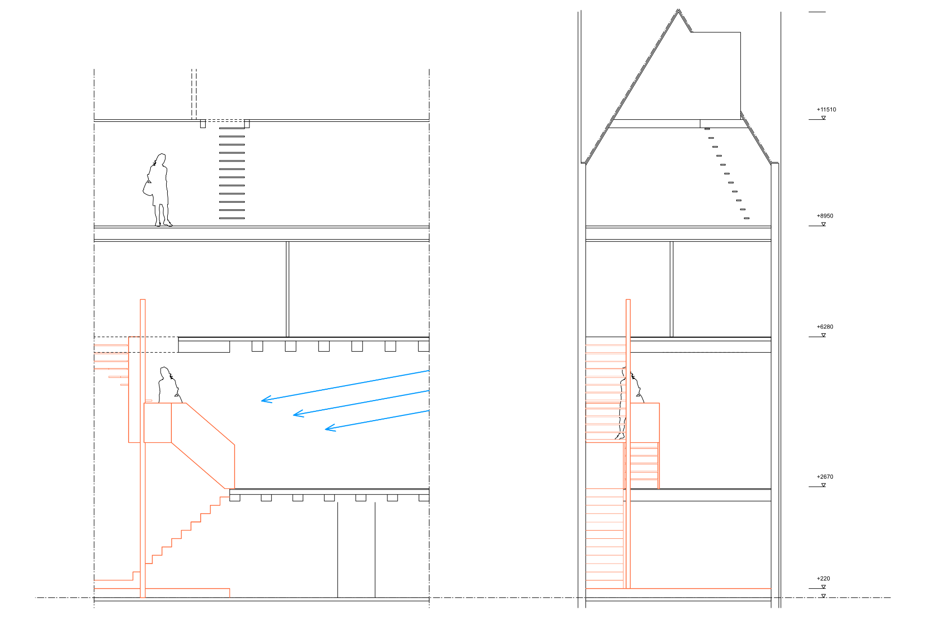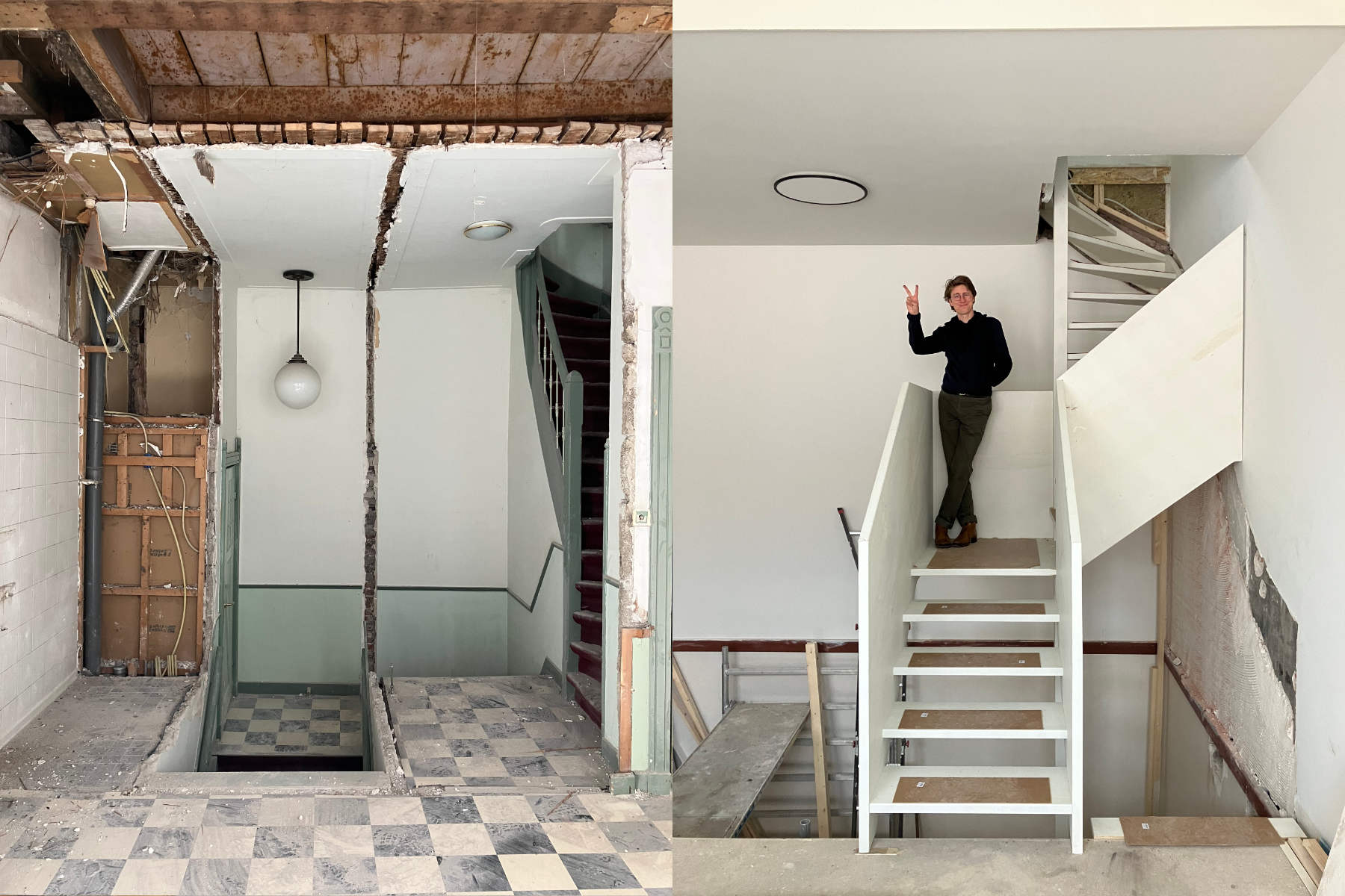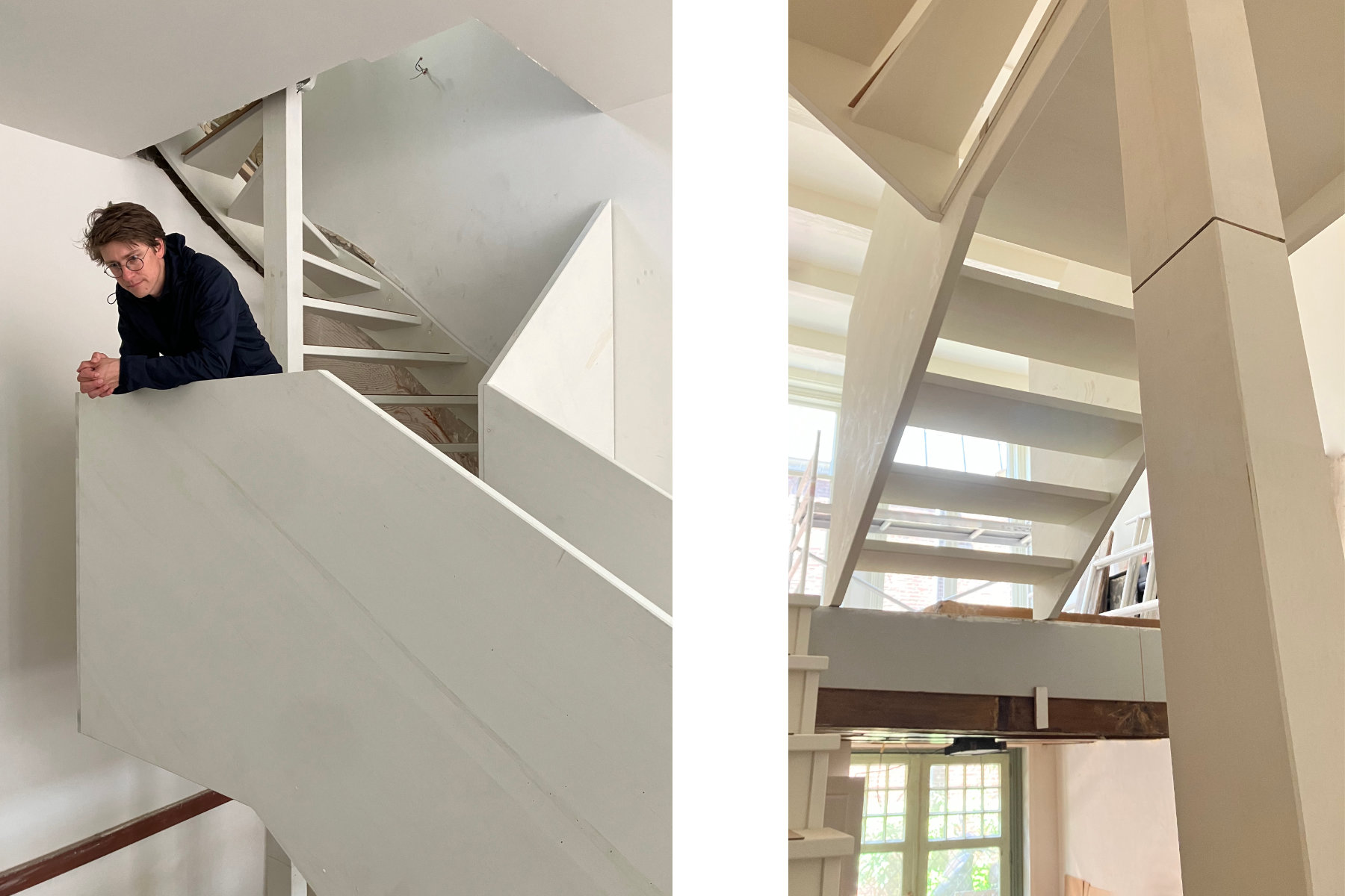 De nieuwe, langs de zijwand geplaatste trap versterkt door zijn vertikale karakter de ruimtelijke verbinding van de twee ruimtes.
