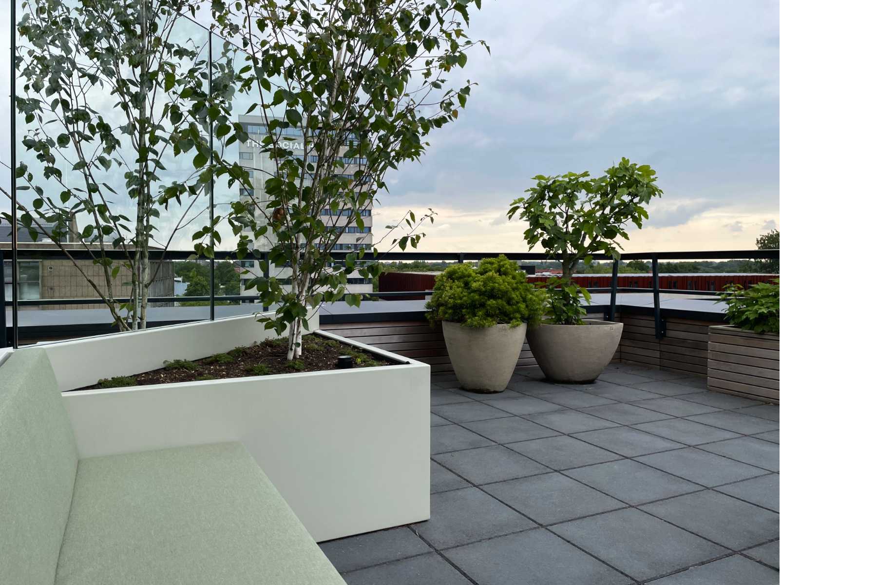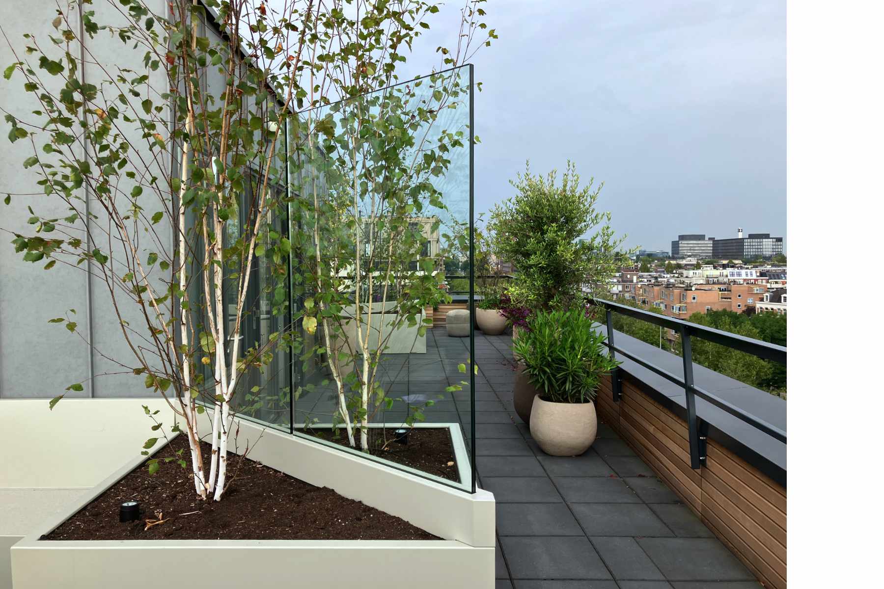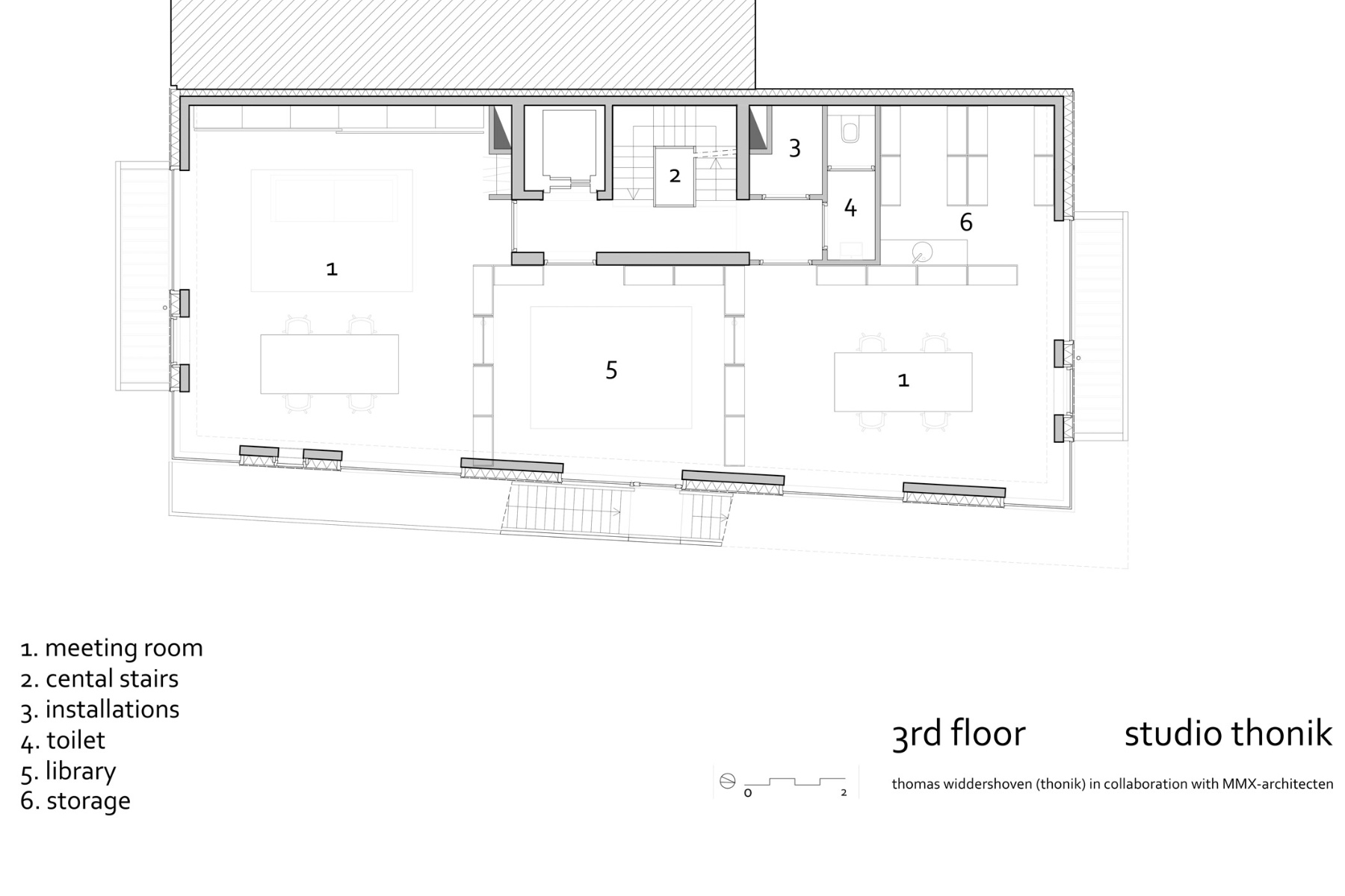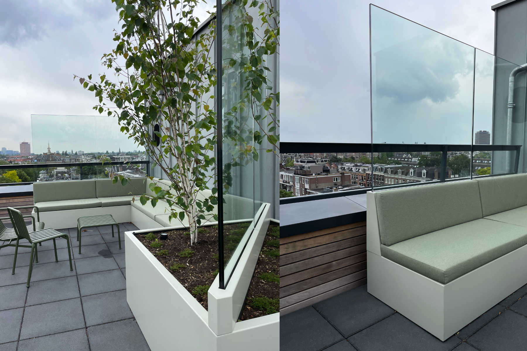 In nauwe samenwerking met Thomas Widdershoven is het dakterras van Studio Thonik ontworpen. Inclusief de technische uitwerking, de vergunningsaanvraag en de uitvoering. De noodzakelijke windschermen zijn uitgewerkt als meubels. De glasplaten, de banken en plantenbakken en een frame onder de betonnen tegels vormen samen één constructie om de windbelasting op te vangen. Aan het prijswinnende gebouw op de Wiboutstraat in Amsterdam (ontwerp Thomas Widdershoven i.s.m. Arjan van Ruyven) is zo een extra buitenkamer toegevoegd.
