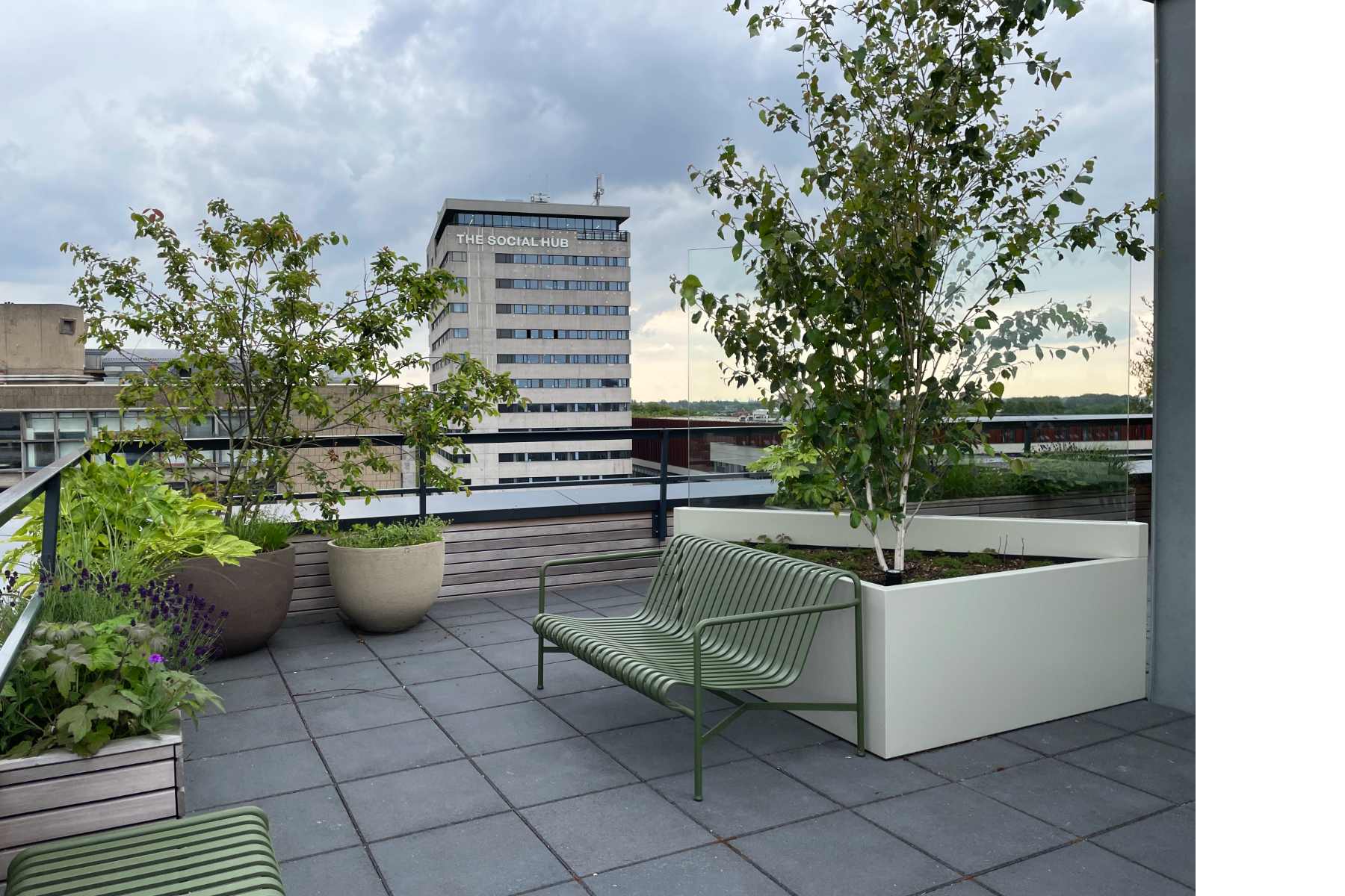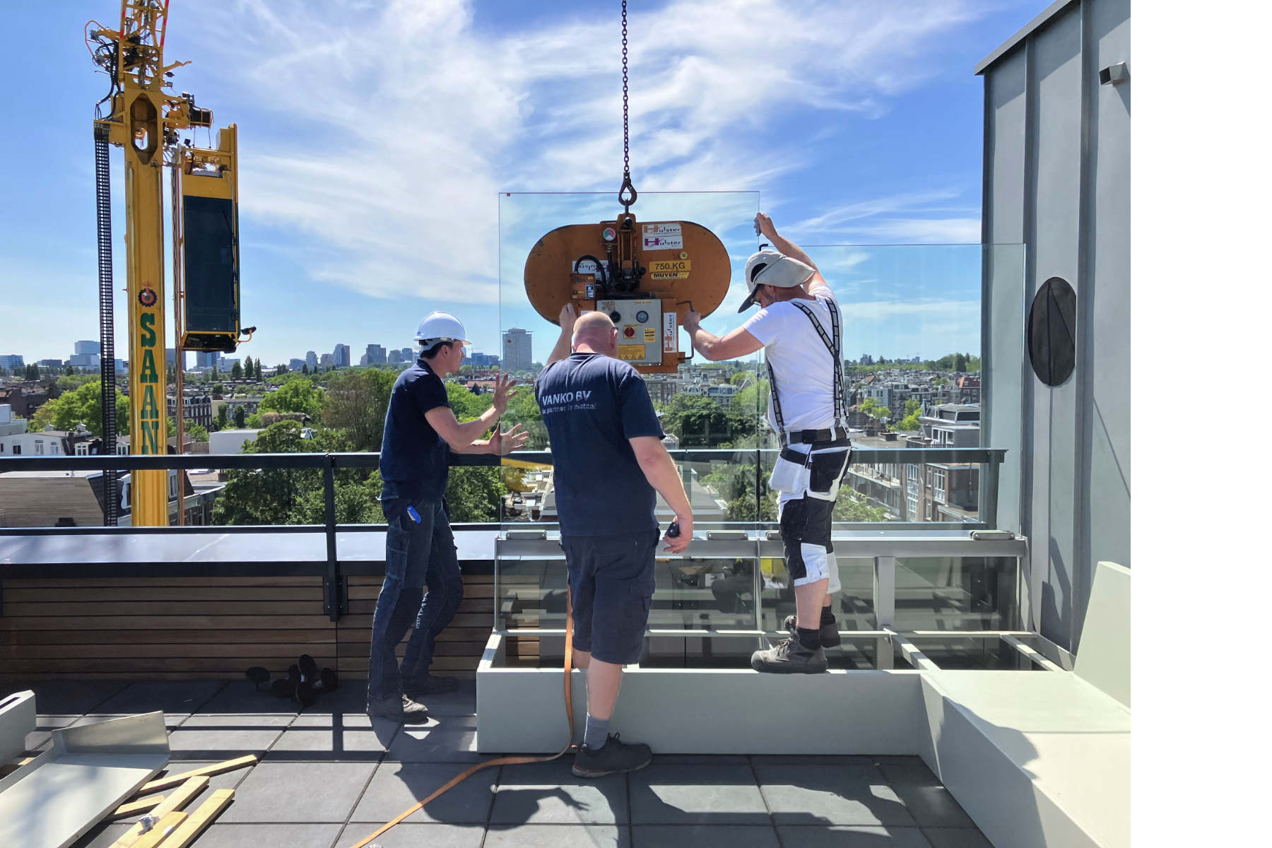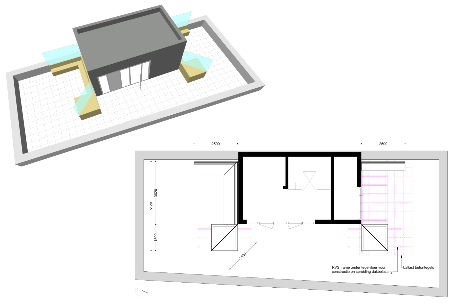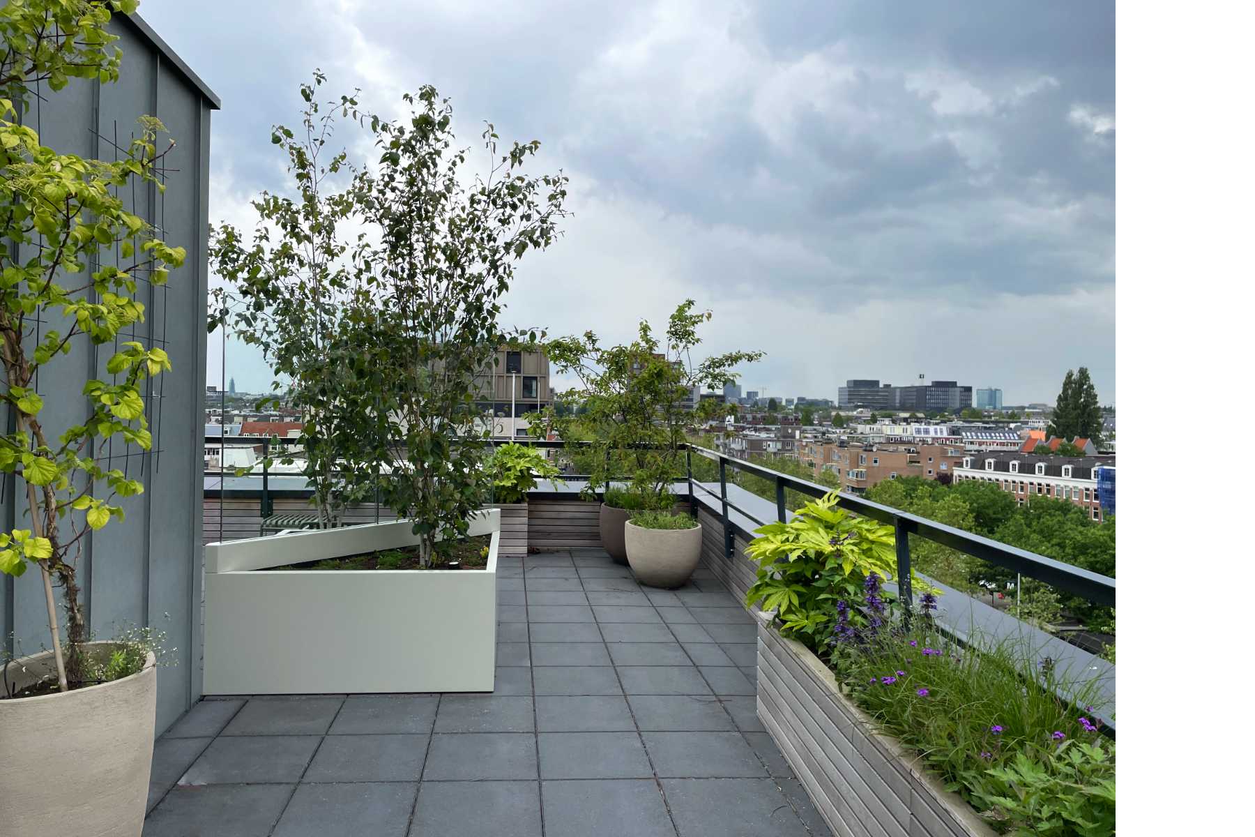 In nauwe samenwerking met Thomas Widdershoven is het dakterras van Studio Thonik ontworpen. Inclusief de technische uitwerking, de vergunningsaanvraag en de uitvoering. De noodzakelijke windschermen zijn uitgewerkt als meubels. De glasplaten, de banken en plantenbakken en een frame onder de betonnen tegels vormen samen één constructie om de windbelasting op te vangen. Aan het prijswinnende gebouw op de Wiboutstraat in Amsterdam (ontwerp Thomas Widdershoven i.s.m. Arjan van Ruyven) is zo een extra buitenkamer toegevoegd.